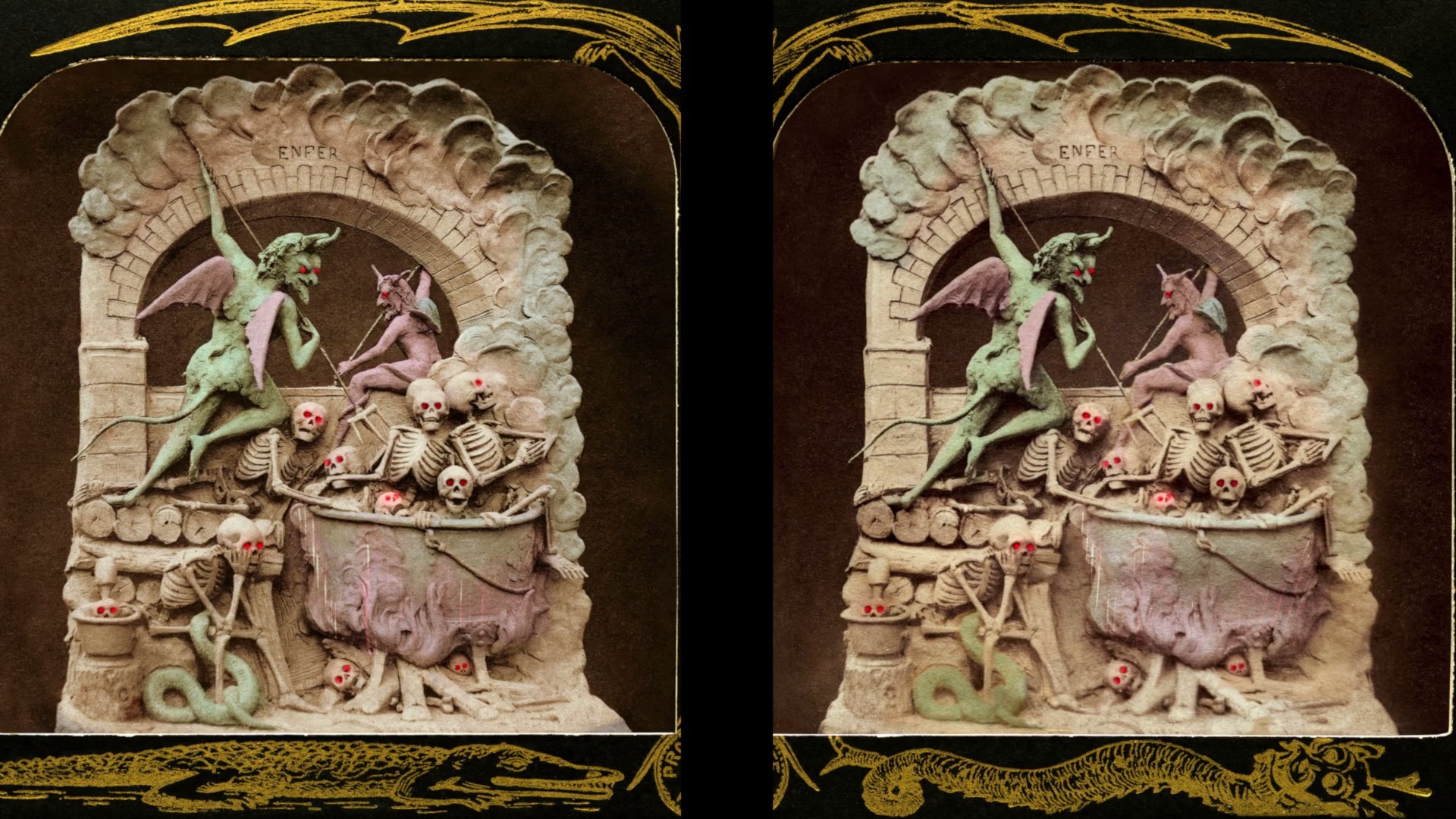 Aus dem Stereoscopic Archive of Sir Brian May werden Stereokarten aus dem Jahre 1860-1870 gezeigt. Les Diableries Stereoscopic Adventures in Hell